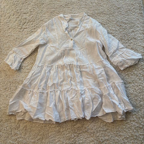 Kaunis rento, mutta naisellinen mekko. Muutoin hyväkuntoinen, mutta toisella olalla tahraa, joka saattaa lähteä pesussa pois. Ainakin kloridilla lähtisi.