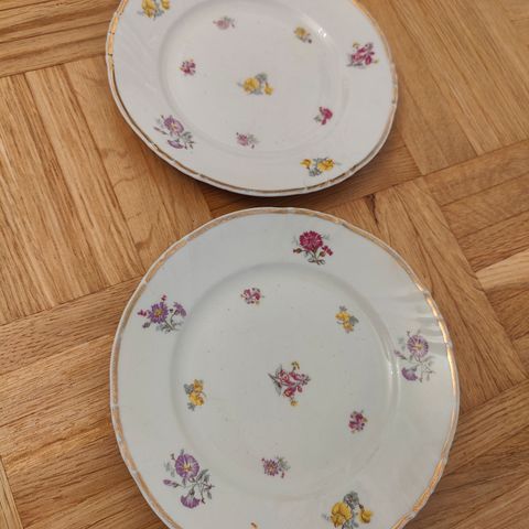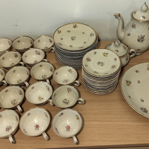 Arabian Rosita-sarjan tarjoilulautanen, kahvikaadin, sokerikko ja kermakko + 8 tarjoilulautasta. Saatu häälahjaksi 1950-luvun alussa, ei juurikaan käytetty, ainakaan 1960-luvun alun jälkeen (olleet vitriinissä). Täysin kunnossa, tarjoilulautasessa paikoin reunan kultaus haalistunut.