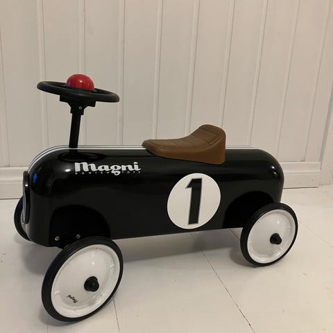Päällä istuttava, potkuteltava auto, jonka istuimen alla säilytystilaa.