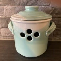 Iso keraaminen säilytyspurkki sipuleille. Purkissa kauniita sipuleiden ja paprikoiden kuvia.