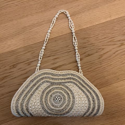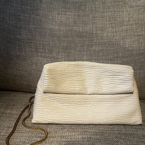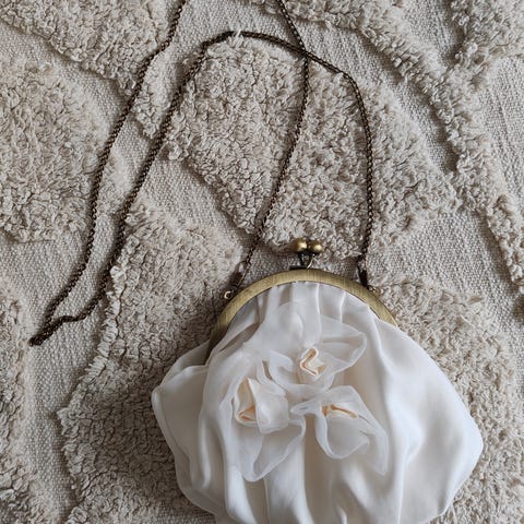 Vaalean beige Glitterin käsilaukku kultaisilla yksityiskohdilla. Pientä käytön jälkeä, joku jälki vetoketjun vieressä ja laukun takapuolella kulumaa/värjäytymää. Ollut itsellä häälaukkuna.
