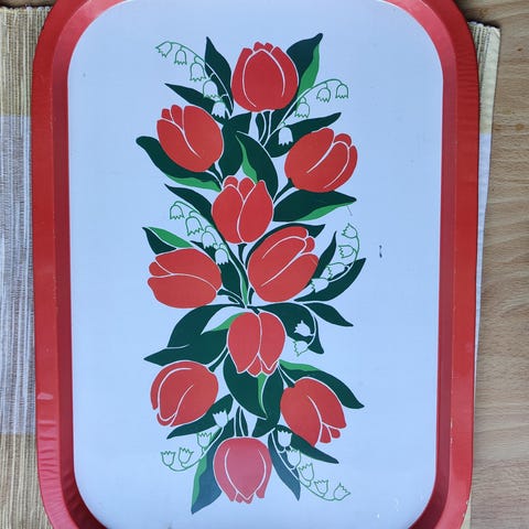 41 cm pitkät kannatinhihnat ja puinen rinkula tarjottimelle. Kangas on kudottu damastikangaspuissa ohuesta karstavillalsngasta.