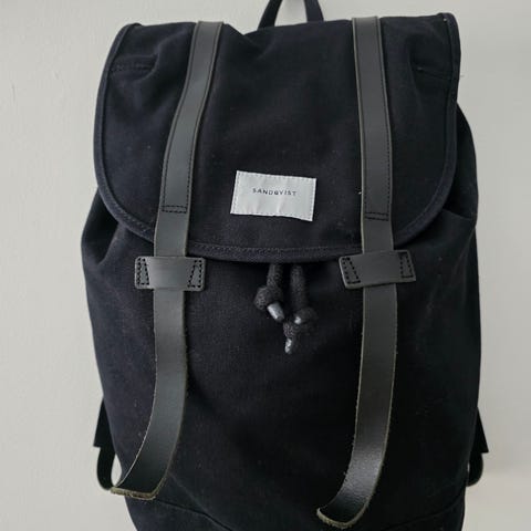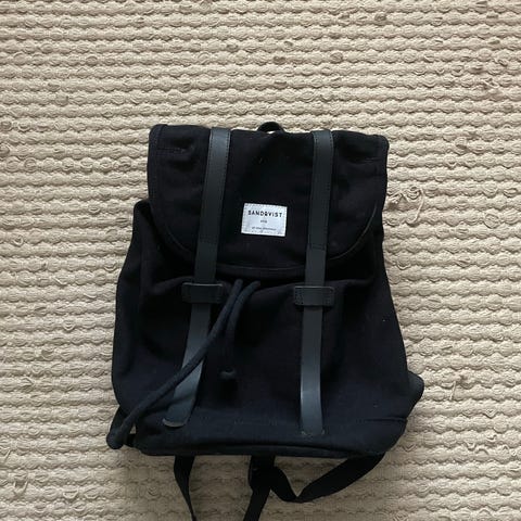Ihana Sandqvistin reppu. Nahkaiset remmit. Vetoketjutasku sisällä. Yhdessä alanurkassa kulumaa pintakankaassa, ei vaikuta käyttöön.