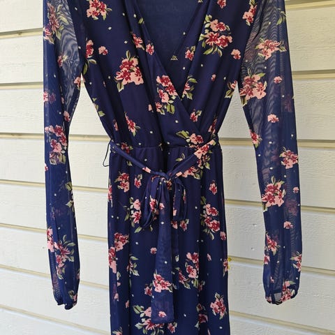 Kaunis romanttinen mekko. Ei jousta. Hyväkuntoinen ja värit kuvista poiketen hyvät. Pari karvaa saattaa tulla kaupan päälle.