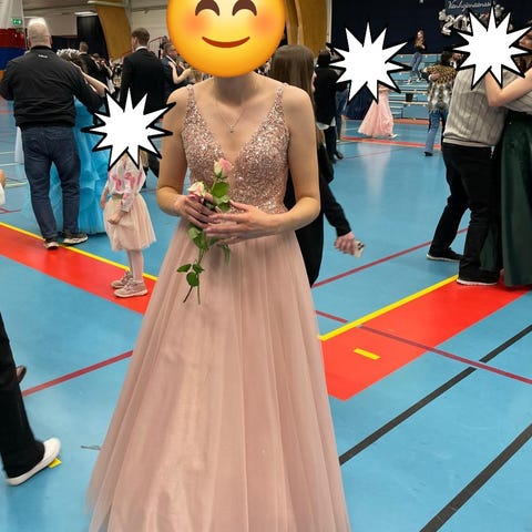 Kerran käytetty kauniin vaaleanpunainen tanssimekko. Vyötärönympärys 70 cm. Tanssittu noin 5 cm koroilla, jolloin 167 cm pitkälle sopiva.