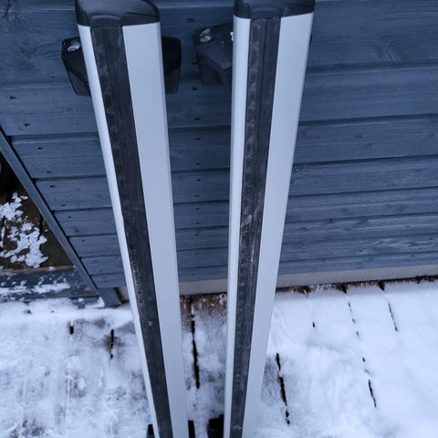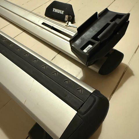 Myydään hyvässä kunnossa olevat Thule wingbar evo 118 kattotelineet varustettuna Thule rapid system 775 kattokaiteisiin kiinnittyvällä jalkasarjalla.
