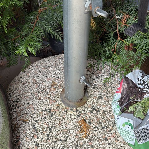 Painava kivinen aurinkovarjon jalka. Ehjä. Patinaa pinnassa, samnaleen voi rapsuttaa irti. Nouto.