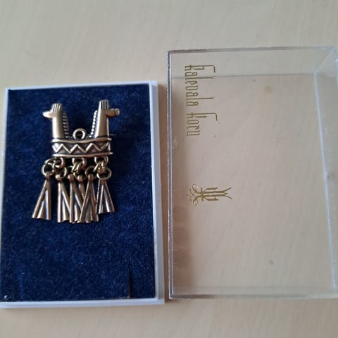 Kaksipäinen hevonen, rintakoru/riipus (ei ketjua). Pronssia. Kork. 4 cm ja lev. 3,5 cm.