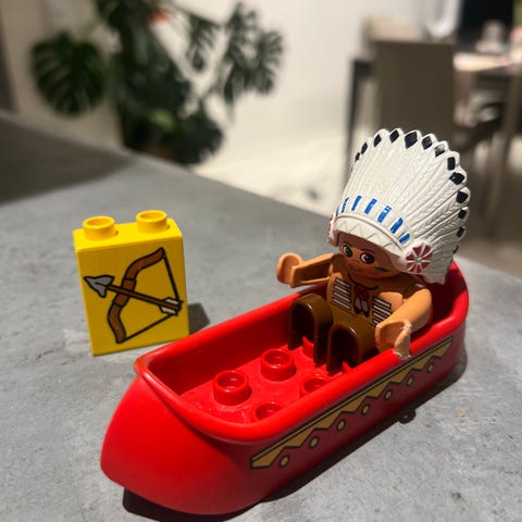 Lego duplo, mielikuvitus leikkeihin harvinaisempi intiaanikylä, intiaanipäällikkö ja kolme muuta hahmoa, kaksi intiaanitelttaa ja kaksi kanoottia. Neljä eläintä ym. Kuvan mukaiset palikat ja muut osat. Leikitty siisti kunto. Kts. kuvat.