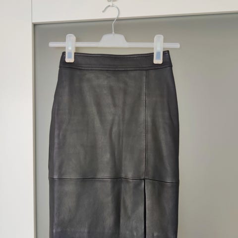 Käyttämätön uusi nappanahkahame. Nahka on lampaannahkaa. Luonnossa väri on harmaaseen vivahtava ruskea, ei niin keltainen kuin kuvassa. Hameen alaosassa on poikkileikkaus. Takana helmassa halkio. Hameessa on musta kangasvuori. Vetoketju selkäpuolella. Saksalainen kokomerkintä vastannee suomalaista kokoa 44. Kts. mitat.