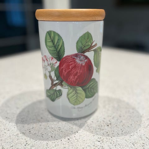 Chemist Prints -potta, jonka Portmeirion valmistaa 1960-luvulla. Se on upeassa kunnossa ja siinä on kolme tai neljä vaikeasti havaittavissa olevaa säröä eikä vaurioita. Yleensä hulluus on lähes aina nähty vintage Portmeirion kohteita.