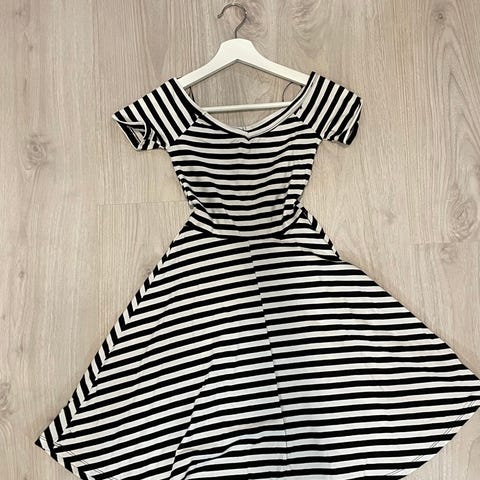 Zaran raidallinen sinivalkoinen trikoomekko. Materiaali jotain joustavaa puuvillasekoitetta.