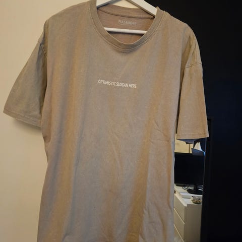 Käytetty t-paita kokomerkintä L. Paidassa on rinnassa slush -painatus ja paidan helmaa harmaa tyylittely.