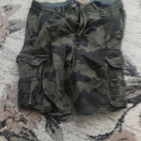 Siistikuntoiset miesten lautailushortsit. Takana tasku, jossa kuminauha avaimille ja vyötäröllä kiristysnauha ja tarrakiinnitys. Takataskun päällä oleva teksti kulunut ja kiristysnauhoissa nukkaa. Kokolapussa 36, vastaa XL kokoa.