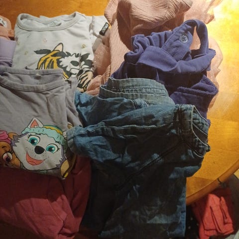 Myydään vaatepaketti kokoa n 86-104. Mekkoja, housuja, t-paitoja, pitkähihaisia, fleesejä, yöpaita, hame, sukkahousuja. Kaikkia vikoja en käynyt läpi. Nouto Tiituspohja tai Seppälä