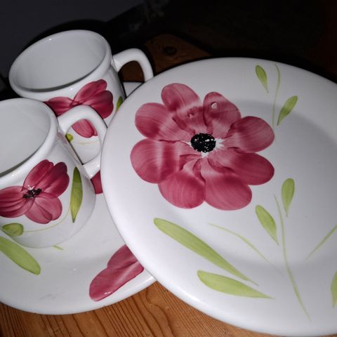Musta kukkakuvio lautaset keraaminen. Ne soveltuvat hyvin päivittäiseen käyttöön tai koriste-esineiksi. Valmistettu kestävästä keramiikasta. 2 lautasta, ei kuppeja. Ei tietoa merkistä.