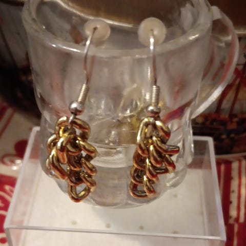 Käsintehdyt / kootut korvakorut. Renkaat ovat 18K kullattua kirurginterästä ja riipus kultaisen värinen.