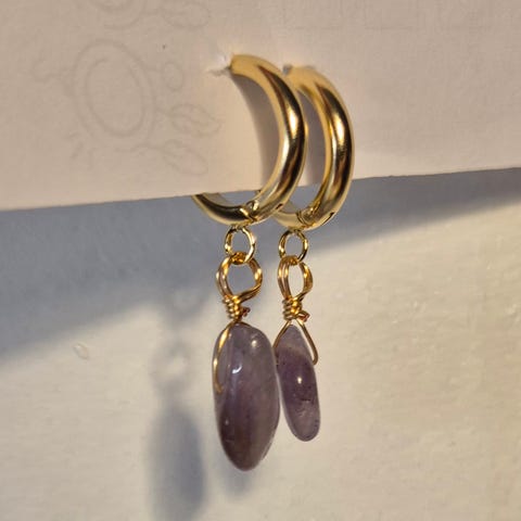 Käsin valmistetut korvakorut. Renkaat ovat 18K kullattua kirurginterästä ja riipukset kullan väristä kromia.
