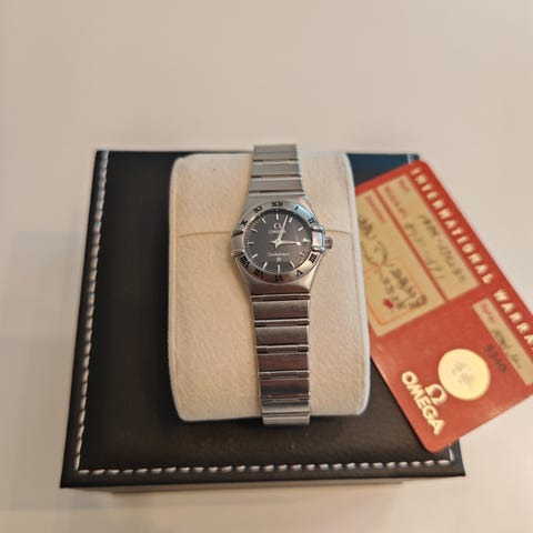 Omega naisten rannekello 18K, jossa kaksivärinen teräsranneke. Kellossa on pyöreä kellotaulu, timantti reunuksin.