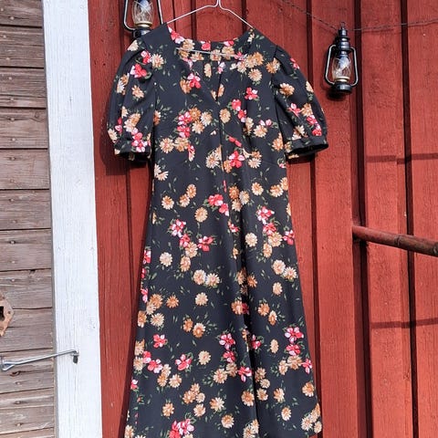 Kukkamekko vyöllä ja taskuilla. Materiaali tiedot puuttuvat. Pituus 98cm, vyötärö 33cm ja Kainalo-Kainalo 38cm.