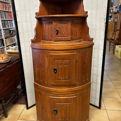 Sympaattinen vanhan kulmakaappi myytävänä. Pinnat aikanaan uudelleen maalattu. Avaimet tallessa ja lukot toimivat. Runko ehjä ja tukeva. Alahylly puuttuu. Sisustassa naarmua ja jälkiä. Ei hajuja.