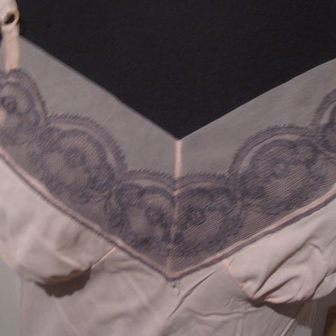 Nuden värinen alushame kuminauhalla. Materiaali tiedot puuttuvat. Pituus 61cm ja vyötärö 34cm-49cm.