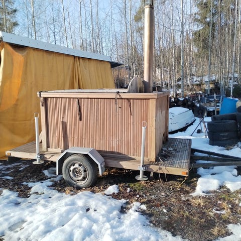 Elämää nähnyt kylpytynnyri. Kuitenkin kaikinpuolin ehjä. Ei vuotoja ja vedet pysyy myös paljussa, niin kuin pitääkin. Penkki kannattaisi uusia. Autotielle n. 15m. Ostaja vastaa kuljetuksesta.