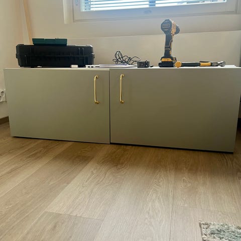 Tv-taso on päällisin puolin hyvässä kunnossa, mutta paikoitellen on pientä kulumaa. Kaksi selvintä kulumakohtaa näkyvät viimeisissä kuvissa. Tässä mallissa on rullattavat jalat, joissa on jokusen sentin säätövara. Tähän saa kuitenkin asennettua Ikeassa myytävät Bestå tv-tasolle tarkoitetut jalat.