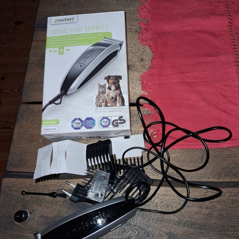 Trimmeri, karvanleikkuri. Kohtalaisen vahva trimmeri paksullekin karvalle. Kaksi erilaista leikkuuterää. Kammat 3mm, 6mm, 9mm ja 12mm. Kammat eivät oikein pysy itsestään paikoillaan, täytyy pitää kiinni samalla kun käyttää konetta. Mukana myös öljypullo ja puhdistusharja. Verkkovirtakone.