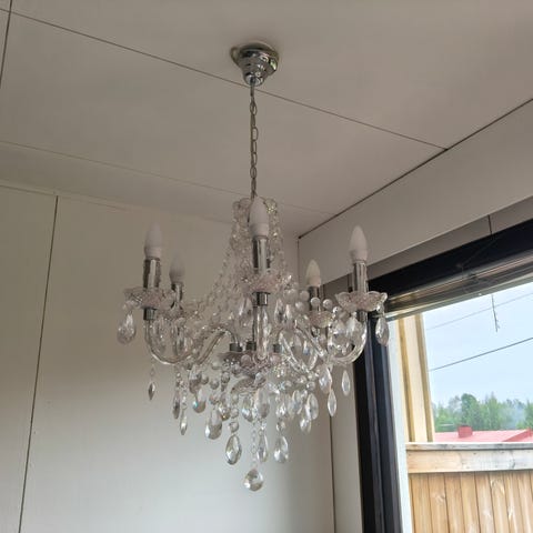Messinkinen 5-polttimoinen kattokruunu uuteen kotiin. Näyttävä, painava. Johtoa/riimua on korkeaankin kattoon.