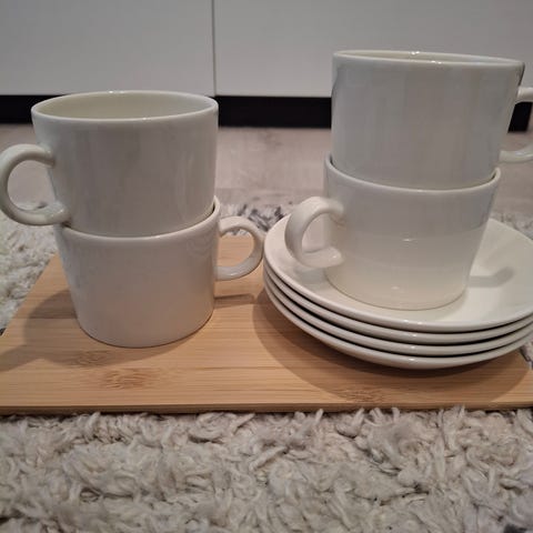 Kuvan mukaiset hyvässä kunnossa olevat n.3,5dl mukit ja puualuset. Mukit ehjiä. Hinta postituksineen 37 euroa.