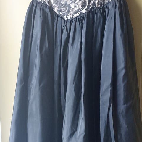 Helmaosassa satiini, jonka päällä harso. Harsossa kimalletta. Takaosassa nyöritys.