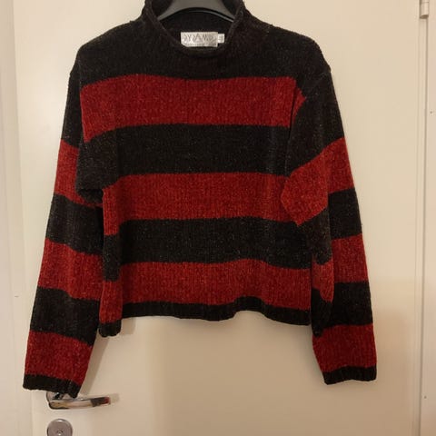 Vaalea beige. Ohut neulepaita, sivuilta avonainen. Muutama langannousu on mut yleisilme siisti.