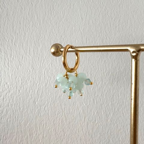 Turkoosit lasihelmi-korvakorut. Kokonaispituus noin 2,5cm. Allergisoimaton kullansävyinen rengas.