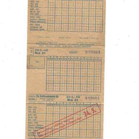 Yli 76 vuotta vanhat, erittäin harvinaiset numerojärjestyksessä olevat Veikkauskupongit kierrokselta N:o 16, jonka viimeinen palautusaika päättyi 20.4.-49.