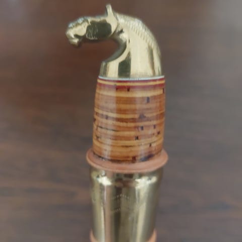 Kahva: puu, messinkilätkä jr27 joukko-osaston logolla ruuveilla kiinnitetty