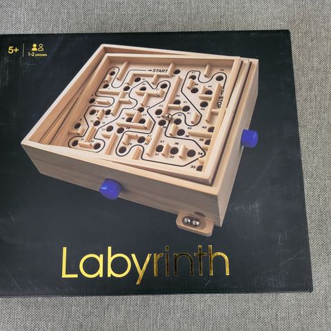 Klassinen Labyrinth-tasapainopeli puusta. Alkuperäinen kuula puuttuu, mutta mukana kuvien mukainen metallikuula, jolla peli toimii hyvin. Peli ehjä. Mukana alkuperäinen laatikko.