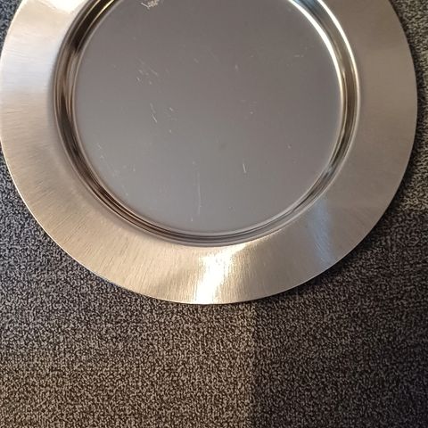 Tyylikäs teräslautanen, pohjapuolella stanssaus "SARPANEVA DESIGN, OPA 18 - 10 FINLAND"