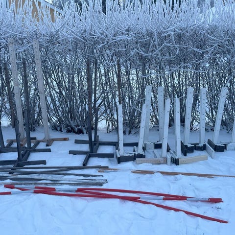 2x 100cm tolpat, 2x 115cm tolpat ja 2x 135cm tolpat, 3 ehjää aurauskeppiä (150cm) eli "puomia", 2 hieman lyhyempää aurauskeppiä (toinen katkennut toinen lyhyempää mallia 110cm, 120cm).