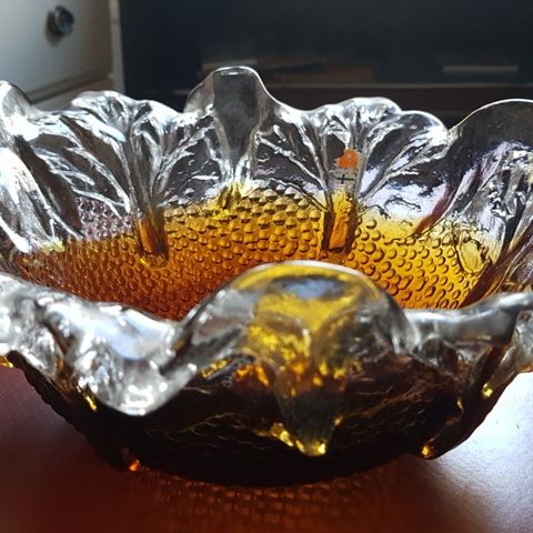 Myydään Mäntyharjun lasin Lara makeiskulho, meripihkan sävyssä.