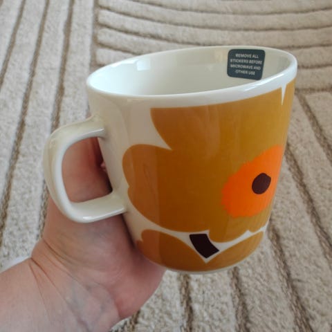 Myydään siniharmaa Marimekon unikko muki 4dl. Erittäin hyvässä kunnossa.