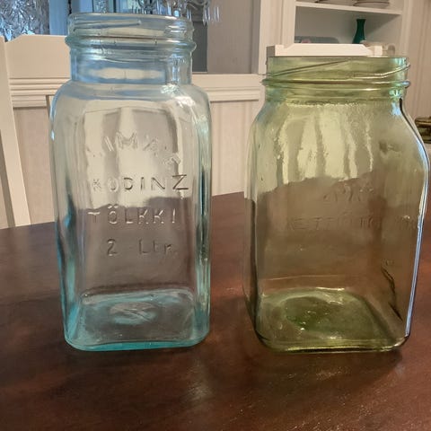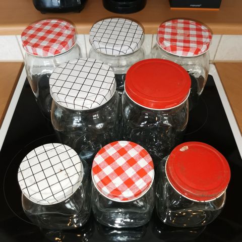 Kuvissa on siis yhteensä siis 7 purkkia kansineen. Lisäksi kaupan päälle vielä yksi Riihimäen lasin metallikantinen lasipurkki, jota en ehtinyt kuvaamaan ja puhdistamaan vattutarroista.