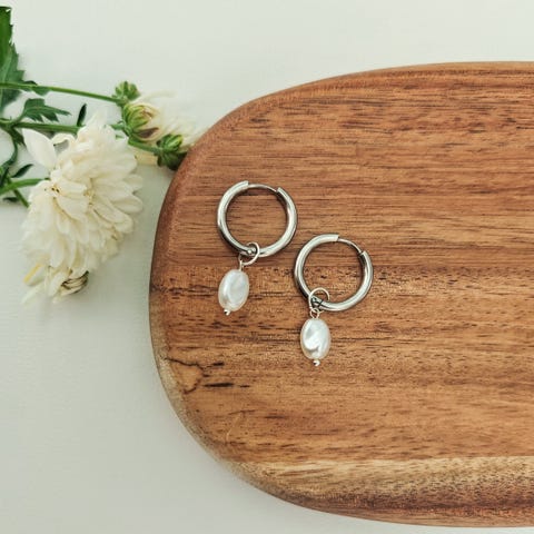 Uudet korvakorut. Rengas on halkaisijalta n.2cm ja koruosat ovat ruostumatonta terästä. Kukat ja helmet ovat akryylihelmiä.