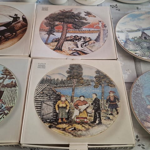 Myydään kuvassa näkyvät Arabia Liisa lautaset yhteensä 6kpl. Sisältää 3kpl syviä lautasia joista yhdessä rike joka näkyy kuvassa sekä 3kpl matalia lautasia. Myydään kaikki yhteishintaan:60€.