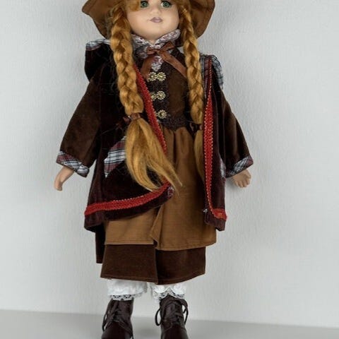 Materiaali: posliini (pää, kädet, jalat), kangasvartalo