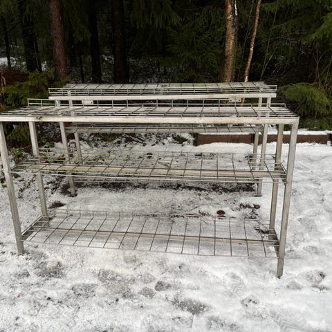 Metos pöytätaso irroitettavilla väliritilöillä. Pöydän kannessa käytön tuomaa ajan patinaa. Mitat pituus 100, korkeus 90 leveys 60 Hp. 165e