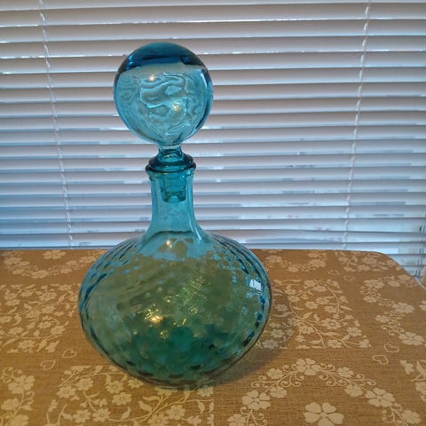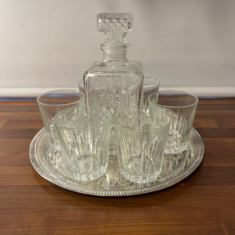 Viinikarahvi, jossa lsdinen korkki. Materiaalina kirkas lasi.