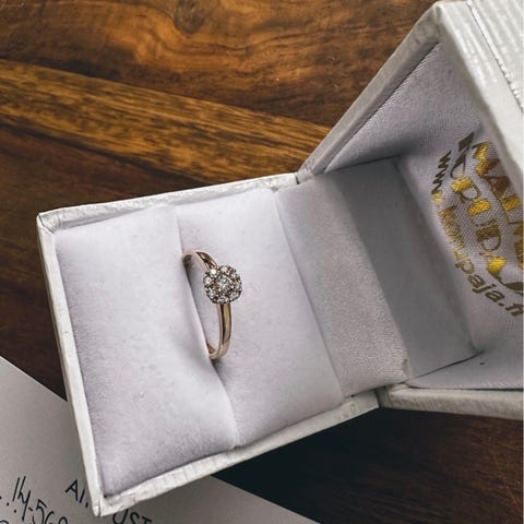 Princess Letizia timanttisormus. Seitsemän timanttia, valko- ja keltakultainen sormus. Koko 15.5. Mukana aitoustodistus.