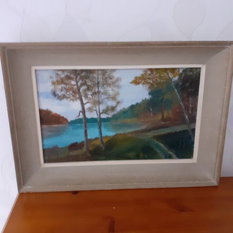 Talvinen maisema taulu, tekijän merkki alakulmassa josta en saa selvää. Taulun koko kork. 40 cm ja lev. 38 cm