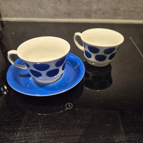 Loistava kunto, ainoastaan kahvikupin tanssin punainen kuvio hivenen kulunut. Yhden setin hinta 30€, molemmat 50€.
